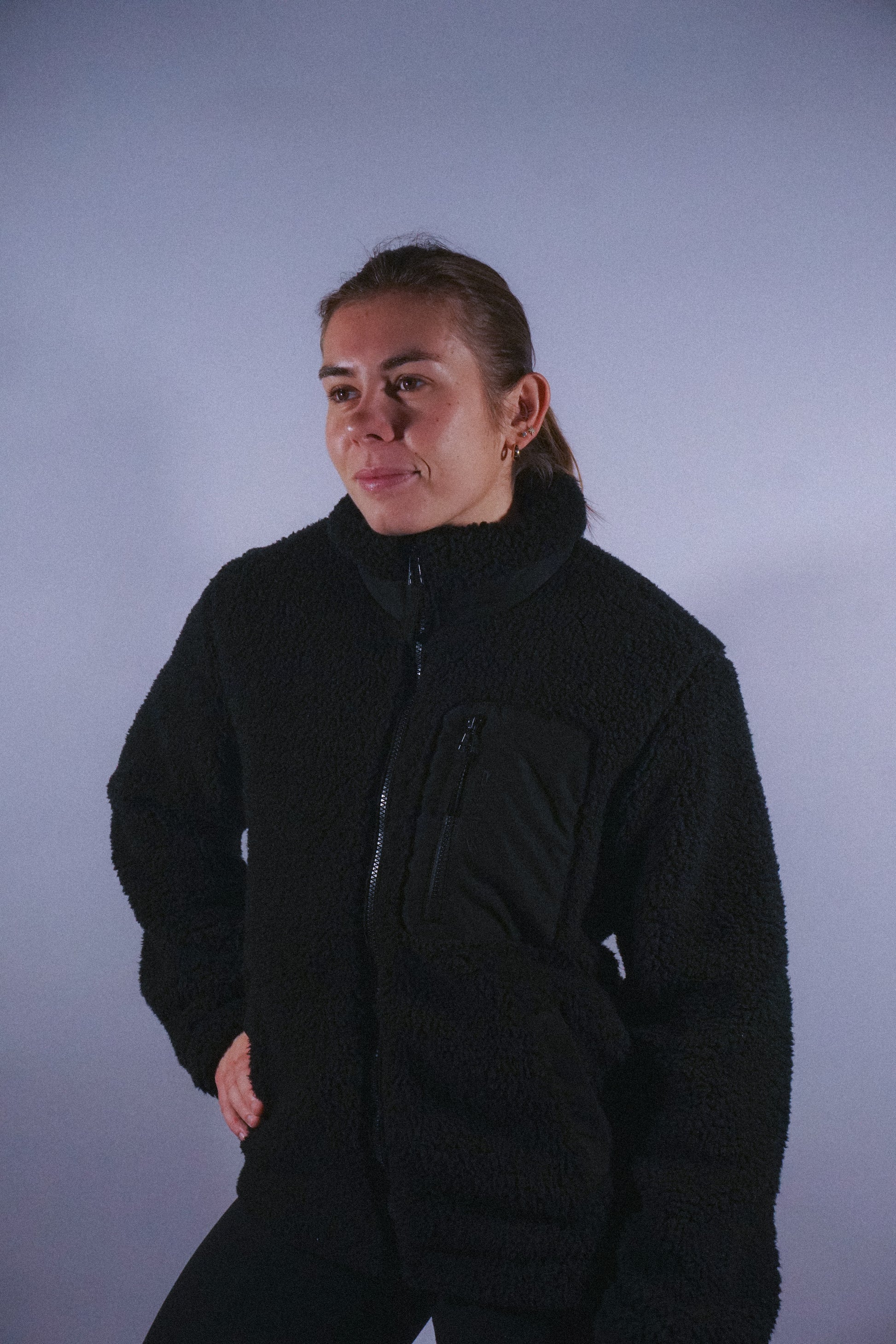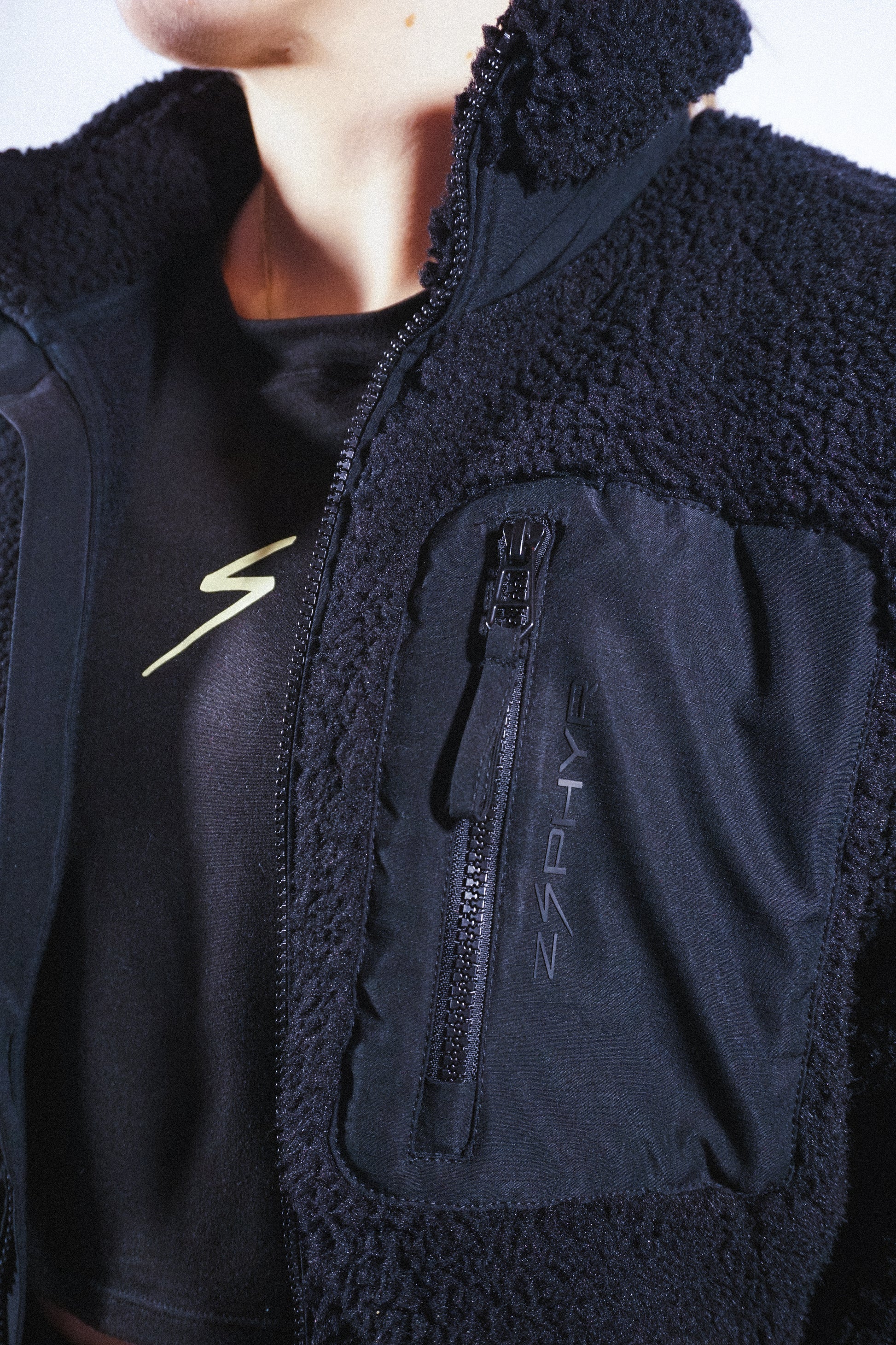 Elle possède une poche poitrine côté cœur avec logo «ZPHYR» en relief silicone, un zip contrasté en plastique recyclé et des finitions soignées: patte intérieure, élastiques invisibles aux manches et au bas du vêtement, ainsi qu'un col doublé sherpa avec bride de suspension au dos.